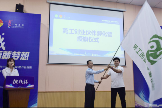 第一期莞工创业伙伴孵化营学生代表黄华朗同学进行发言。黄华朗同学为大家分享自己成为第一期莞工创业伙伴孵化营成员的喜悦和开拓创新、追求卓越的决心,展现出创新创业人的蓬勃朝气。随后,李忠红副书记为第一期莞工创业伙伴孵化营授旗。