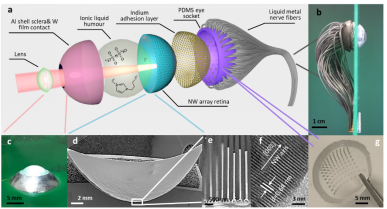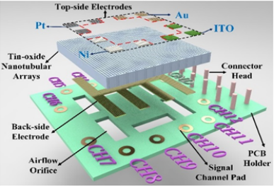 4.阵列传感器和仿生光电传感器(合作者成果):半导体阵列传感器;可同时检测多种有害气体;能耗低寿命长;打破西方国家在高端气体传感器的垄断;采用纳米线光电传感器取代人类视网膜;颠覆性地实现球面光电传感器,国际首创;2020年5月《自然》杂志的封面文章。如图4-1,4-2所示。