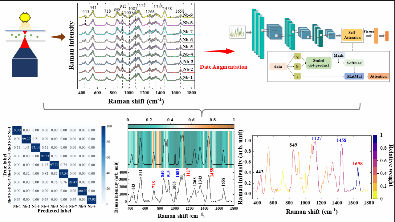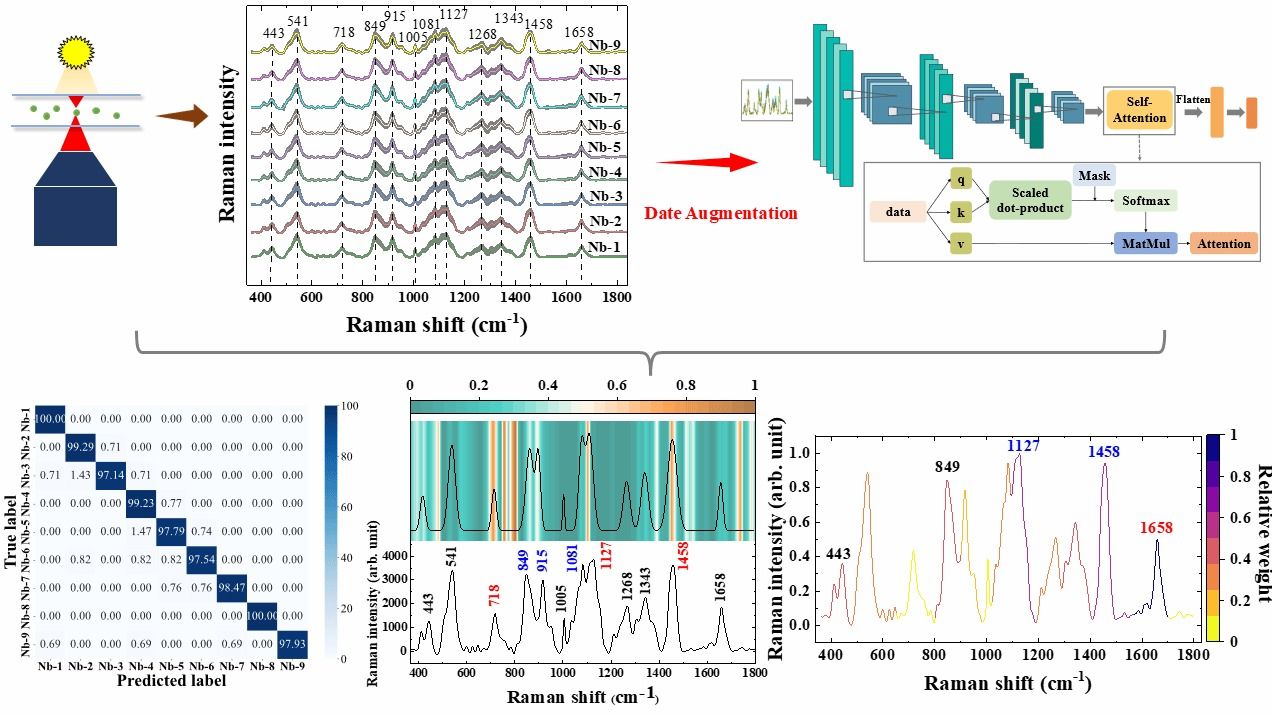 近年来,家蚕微孢子虫(Nosema bombycis, Nb)已被认为是一种危险的病原体,它可通过游离孢子迅速传播导致感染。由微孢子虫感染导致的微粒子病对家蚕业产生严重威胁,每年都会给丝绸业和农业带来巨大的经济损失。因此,如何在单细胞水平上准确识别家蚕微孢子至关重要。在本文中,研究团队创新地提出了一种单细胞拉曼光谱结合自注意力机制介导的卷积神经网络模型,实现准确、快速地识别家蚕微孢子。在自注意力机制和数据扩增技术的辅助下,自注意力机制介导的卷积神经网络模型对家蚕孢子的平均预测准确率提高了将近 18%,从原来的 83.93 ± 4.88% 提高至 99.27 ± 0.25%。此外,研究团队还提出了一种名为阻挡单个拉曼波段的方法进一步提取光谱分类特征。研究结果显示,1658、1458、1127 和 849 cm-1这4个拉曼峰位的差异,对99.27 ± 0.25% 的预测准确率产生主要的贡献。本研究建立的分析方法在家蚕微孢子虫的早期诊断和微粒子病监控等领域具有巨大的应用前景。