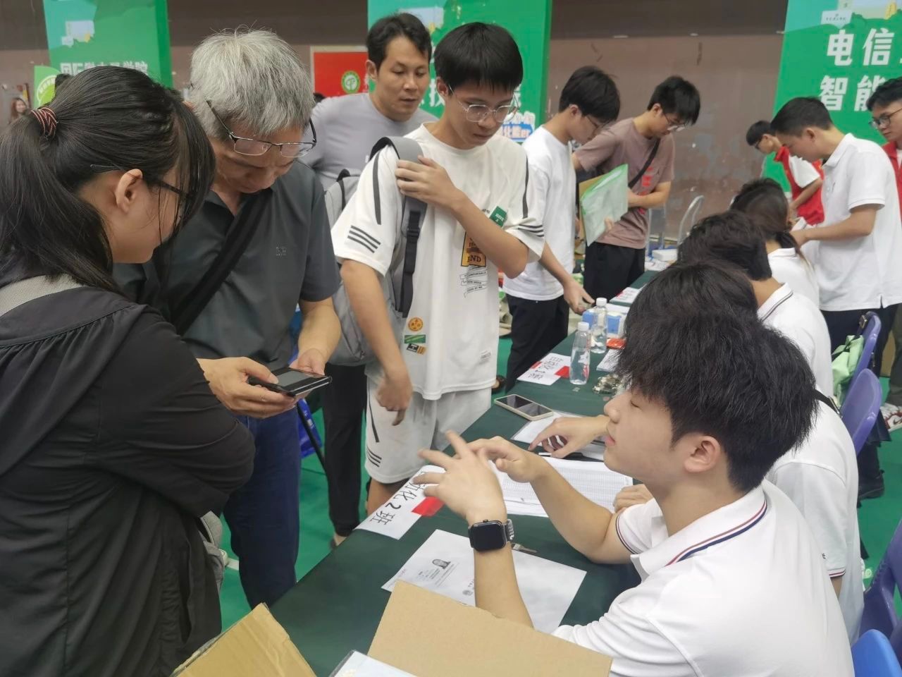 迎新现场,学院老师、助理班主任和迎新志愿者们分工协作,为新生办理各项入学报到手续。