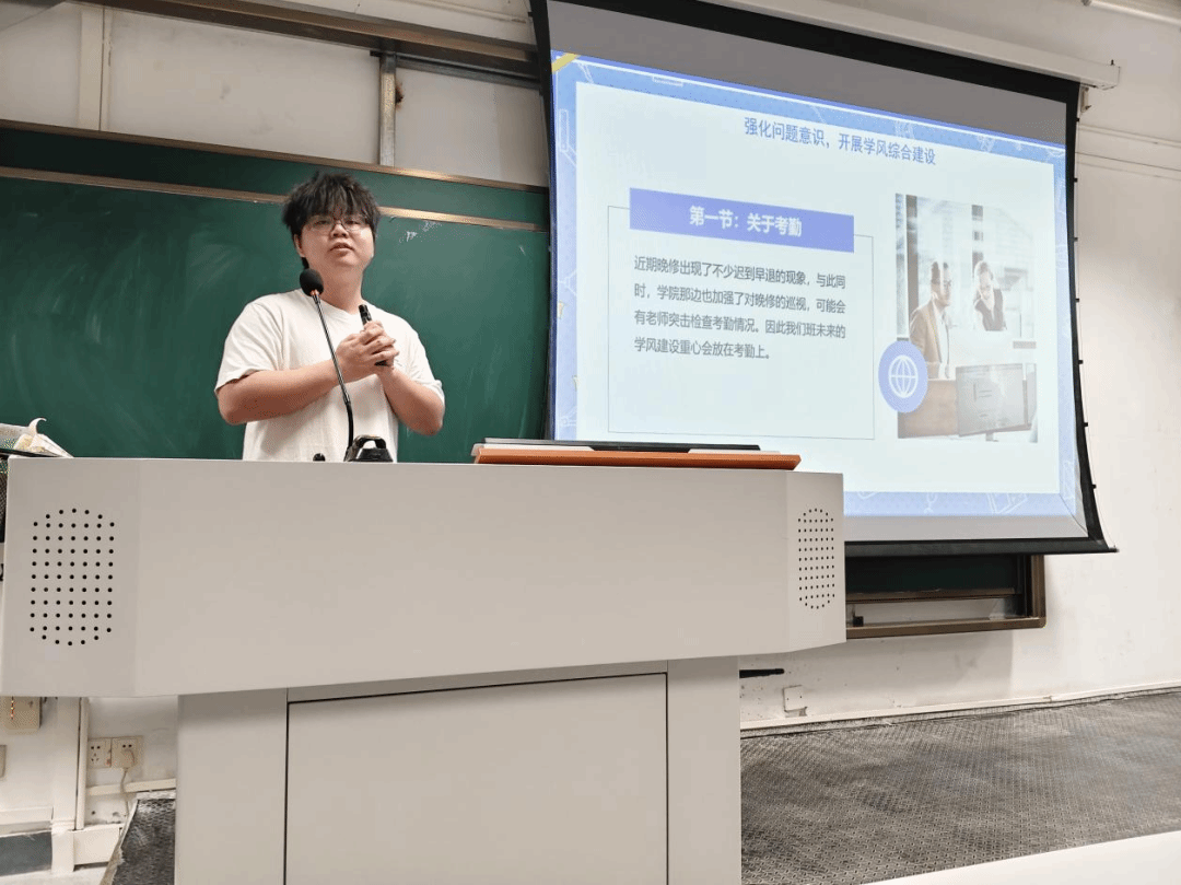 在24自动化2班“树优良学风,创勤学氛围”主题环节中,组织委员着重强调了新学期的考勤要求,提醒同学们注意考勤,避免迟到、早退现象。同时,同学们积极分享学习经验,探讨出多种提升学习效率的实用方法,如制定每日学习清单、成立学习互助小组等。