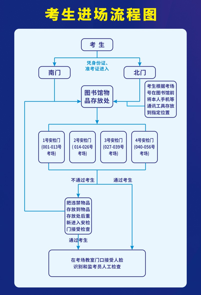3.每场考试开始前,监考人员对所有进入考场的考生进行核验身份证、准考证,考生进入考场内须通过人脸识别通道,与考试无关物品需放置在考场外。