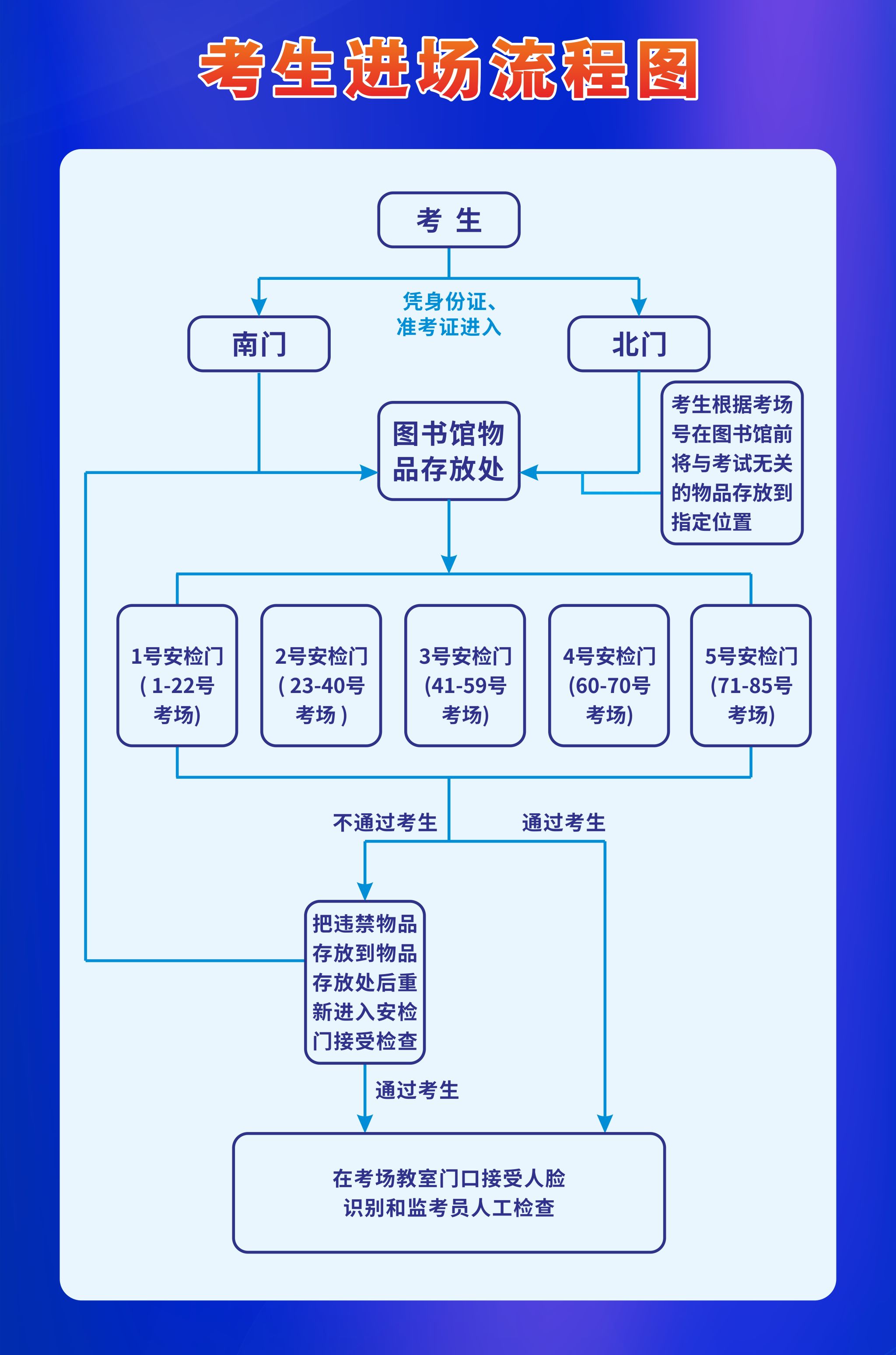 考生凭本人准考证、有效居民身份证件进入考点。届时,我校考点开放南门和北门供考生进校,南门步行至考场需要约10分钟,北门步行至考场需要约20分钟,请考生提前规划好到校路线和做好时间安排。