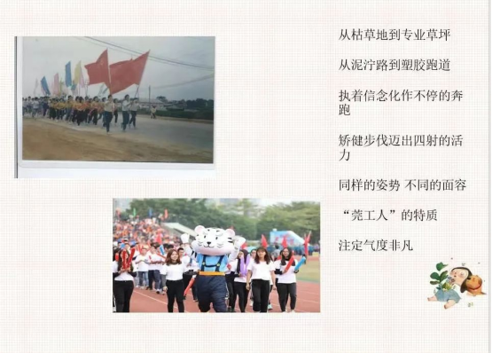 在班会上,同学们翻看了20年前军训、90年代的宿舍楼、图书馆、挂着有年代感标语“您的微笑,就是我们的快乐”的大学生超市、28年前校运会的旧照,莞工的历史变迁、莞工的各个角落在照片中一一展现。通过观看一帧帧老照片和班主任的介绍,同学们得以了解莞工奋进史。从莞工第一届新生开学典礼,小小的教室里挤满了求学的学生,到如今数千人安坐于场馆;运动场从枯草地到专业草坪,从泥泞路到塑胶跑道;30年过去了,莞工一直与同学们一同成长,学校的环境变好了,求学学子也多了,不变的是“爱国奋斗,追求卓越”的莞工精神。
