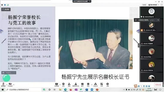 从1933年1月至今,杨振宁先生一直担任我校的名誉校长。在本次班会上,同学们回顾了解了荣誉校长杨振宁先生的成就,以及杨振宁与莞工的故事。杨振宁先生在28年间4次赠墨宝,题写“学而知不足”的校训勉励莞工人;6次莅临学校指导,与莞工师生分享学习和科研的心得快乐;在莞工校园内亲手栽植3株名木;先后在学校设立杨振宁奖学金、杨振宁教研楼、杨振宁创新班;这些都是杨振宁先生寄予莞工学子的厚望,也将是伴随莞工开创下一个十年的美好祝愿。同学们纷纷表示通过班会提高了自己对母校的认同感、自豪感,希望早日返校到杨振宁楼参观学习,近距离地了解和学习莞工历史。