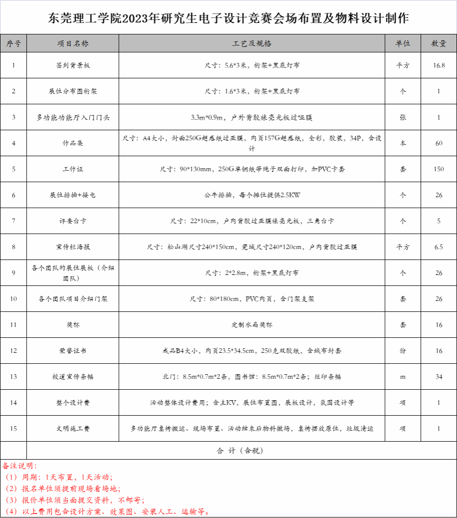 2023年研究生电子设计竞赛会场布置及物料设计制作进行询价采购,请根据询价通知书的要求进行报价。项目的采购基本情况、质量、服务需求和供应商报价所要具备的条件如下: